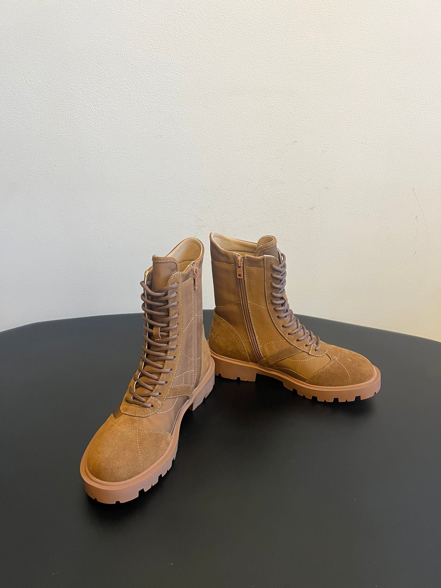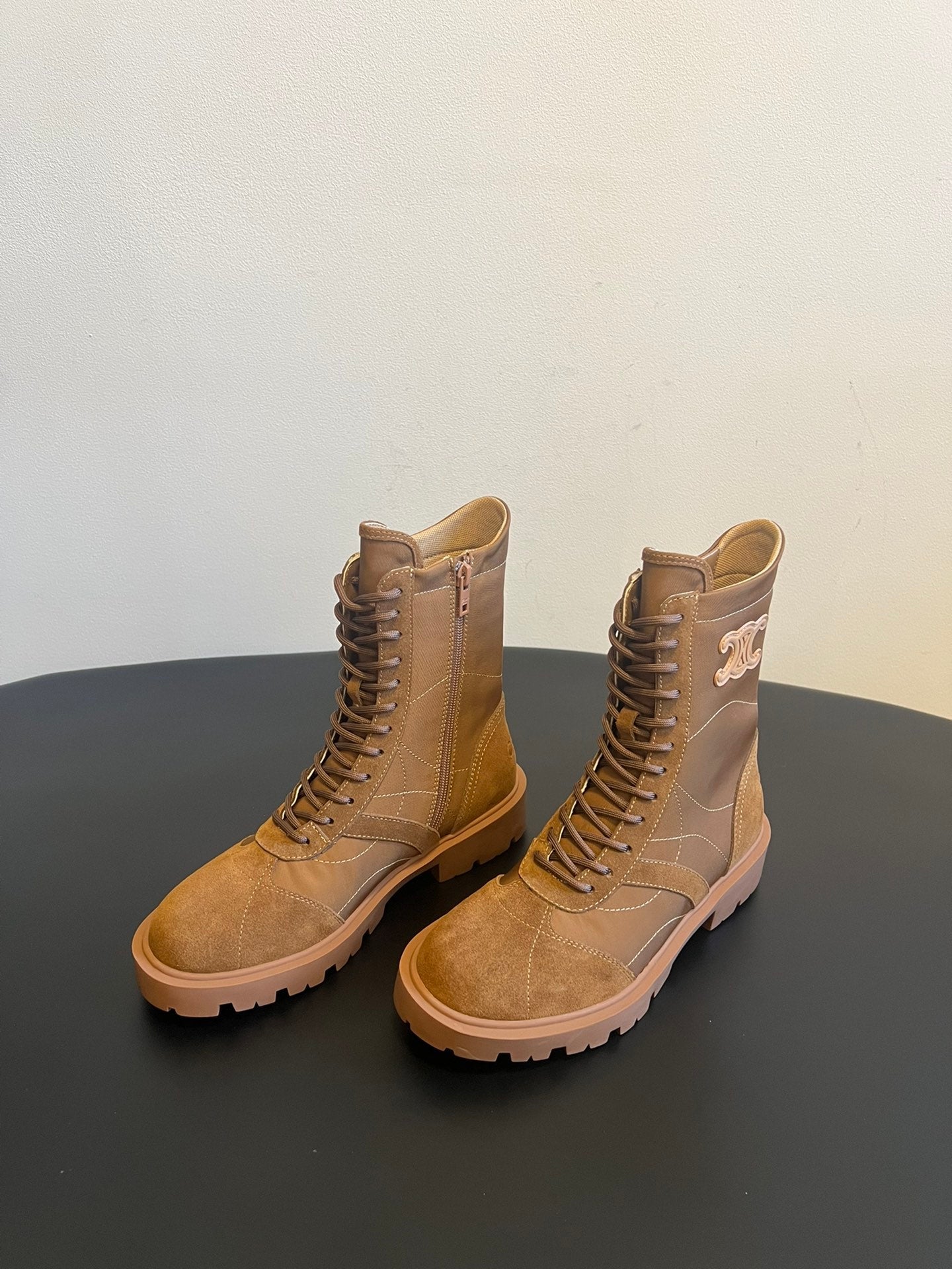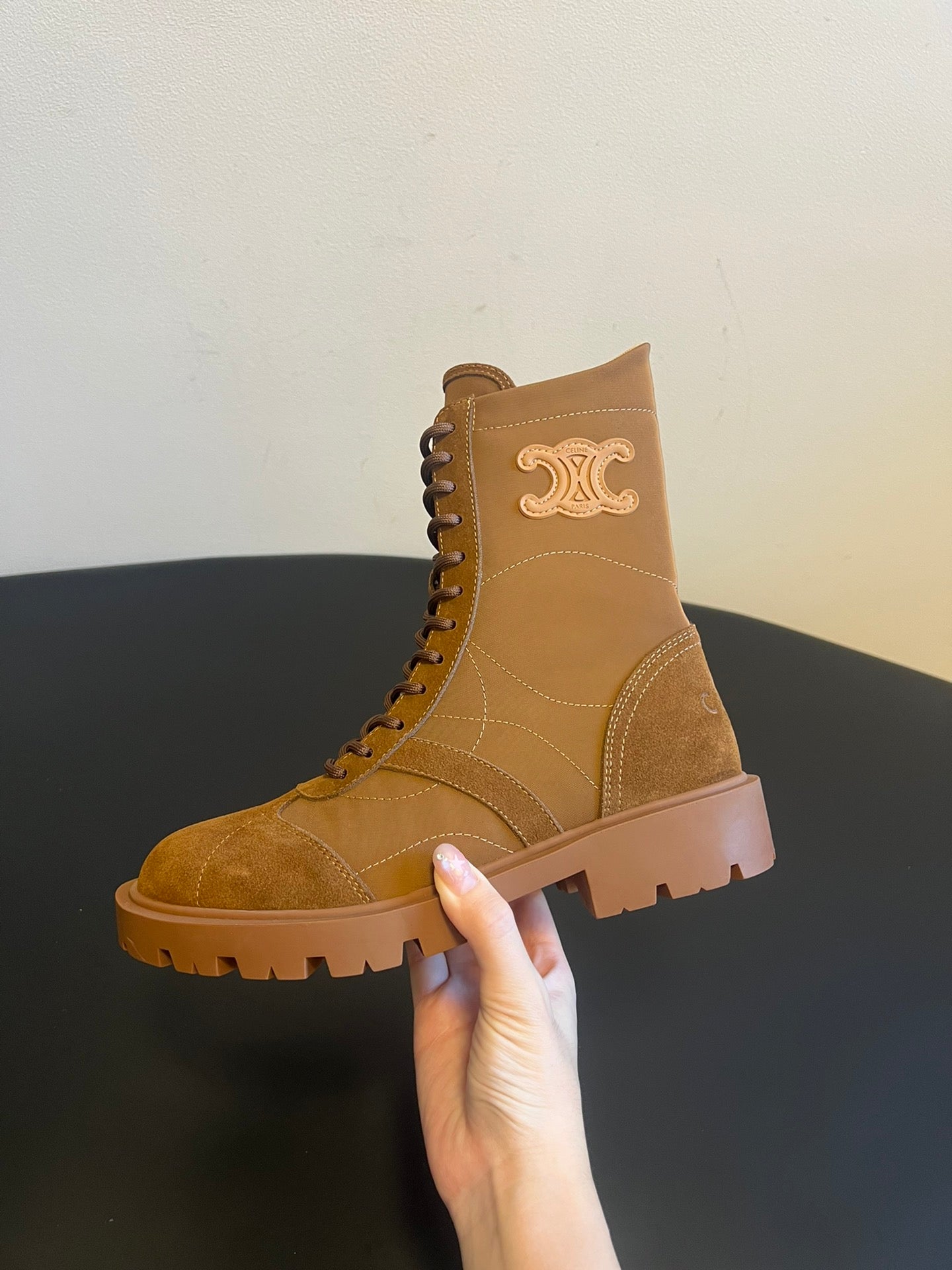 CELINE 26S LACE-UP ANKLE BOOTS IN BROWN SUEDE AND CANVAS